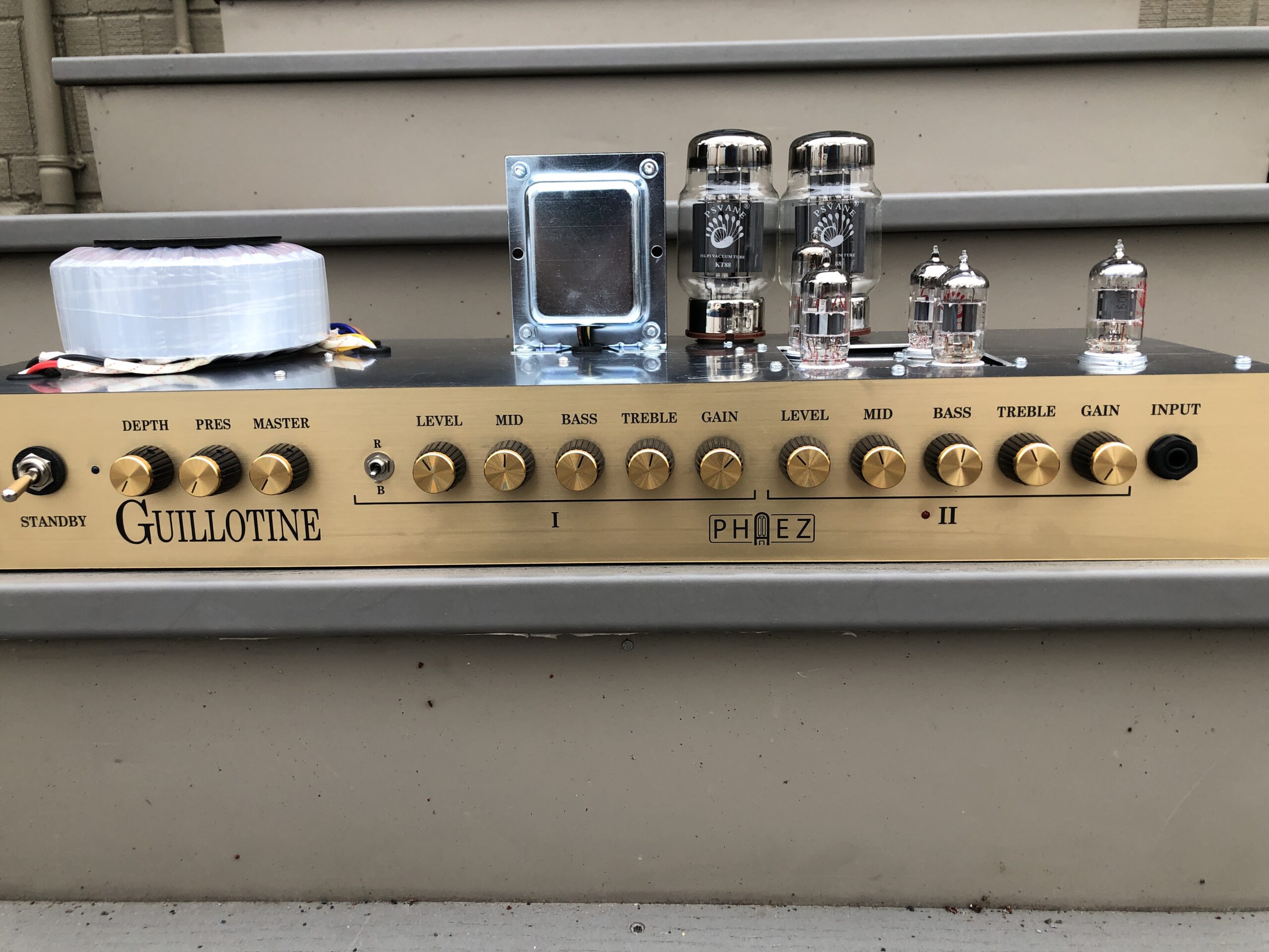 Build your own head cab, or order one from Sourmash. H channel is my latest Croc, and the L channel is Fender blackface twin. This is a tried and true design. This is a channel switcher and is done CORRECTLY! Both channels are state of the art. 8 and 16 ohm speaker connections. Loop. Takes EL34’s in the output section. US$693 chassis only. You’d be looking at maybe $1k to $1.1k with head cab. tubes, shipping.